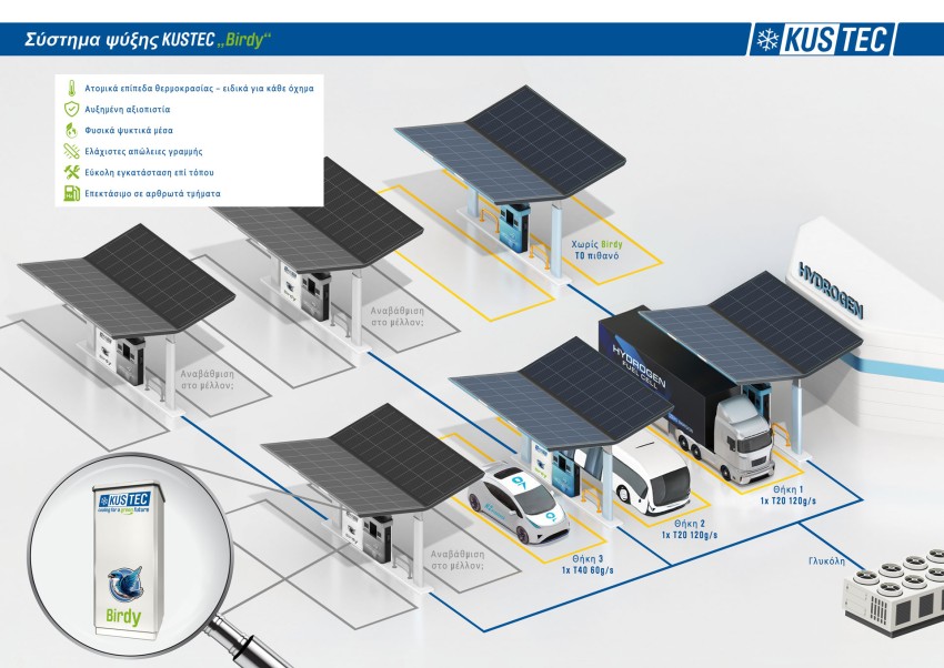 Το σύστημα "Birdy" είναι αποτέλεσμα εντατικής έρευνας και ανάπτυξης και αποδεικνύει τη δέσμευση της KUSTECγια το μέλλον της κινητικότητας υδρογόνου. Έχει σχεδιαστεί για να ενσωματώνεται απρόσκοπτα σε υπάρχοντες και νέους σταθμούς ανεφοδιασμού υδρογόνου για την υποστήριξη ενός ευρέος φάσματος οχημάτων. Η εξαιρετική ψυκτική του ικανότητα εξασφαλίζει τον γρήγορο και ασφαλή ανεφοδιασμό των οχημάτων υδρογόνου – ένας κρίσιμος παράγοντας για την περαιτέρω αποδοχή και διάδοση αυτής της καθαρής πηγής ενέργειας.